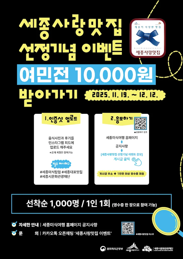 재단은 선정된 세종사랑맛집을 방문한 뒤 후기를 남긴 참여자 선착순 1,000명에게 1인당 1만 원 상당의 지역화폐(여민전) 을 지급할 예정이다. 이벤트 기간은 12일까지이며, 음식점뿐 아니라 카페·베이커리 등 다양한 업종이 포함돼 세종의 폭넓은 미식을 경험할 수 있다.