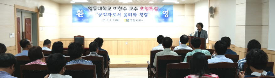 영동세무서(서장 한숙향)는 지난 2일 세무서 대회의실에서 소속 직원들의청렴의식 제고를 위하여 ‘청렴, 淸廉永生 할 것인가?’라는 주제로 영동대학교 이현수 교수를 초빙하여 청렴강의를 실시했다.