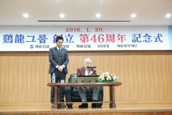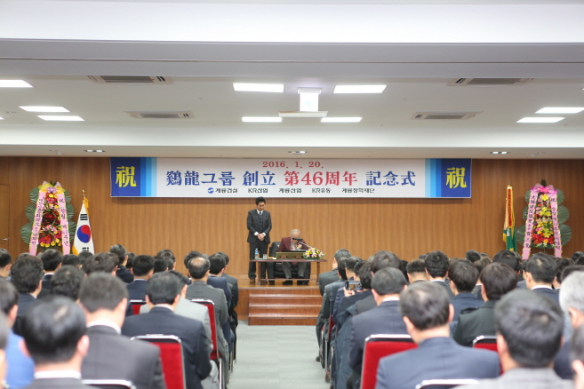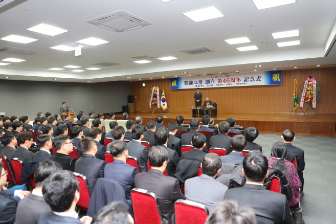 계룡건설은 20일 오전 10시 대전 탄방동 둔산사옥 16층 강당에서 이인구 명예회장을 비롯해 한승구 사장, 이승찬 사장 및 계열사 사장단과 임직원, 협력업체 사장단, 퇴직 임직원 등 500여명이 참석한 가운데 창립 46주년 기념식을 개최했다.