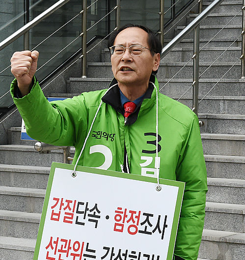 대전시 대덕구의 국민의당 김창수 예비후보는 자신을 검찰에 고발한 대전 대덕구선관위를 향해 강한 불만을 토로하며 8일 오후 2시 대전 서구 월평동 대전선거관리위원회 앞에서 '1인 피켓 시위'에 나섰다.
