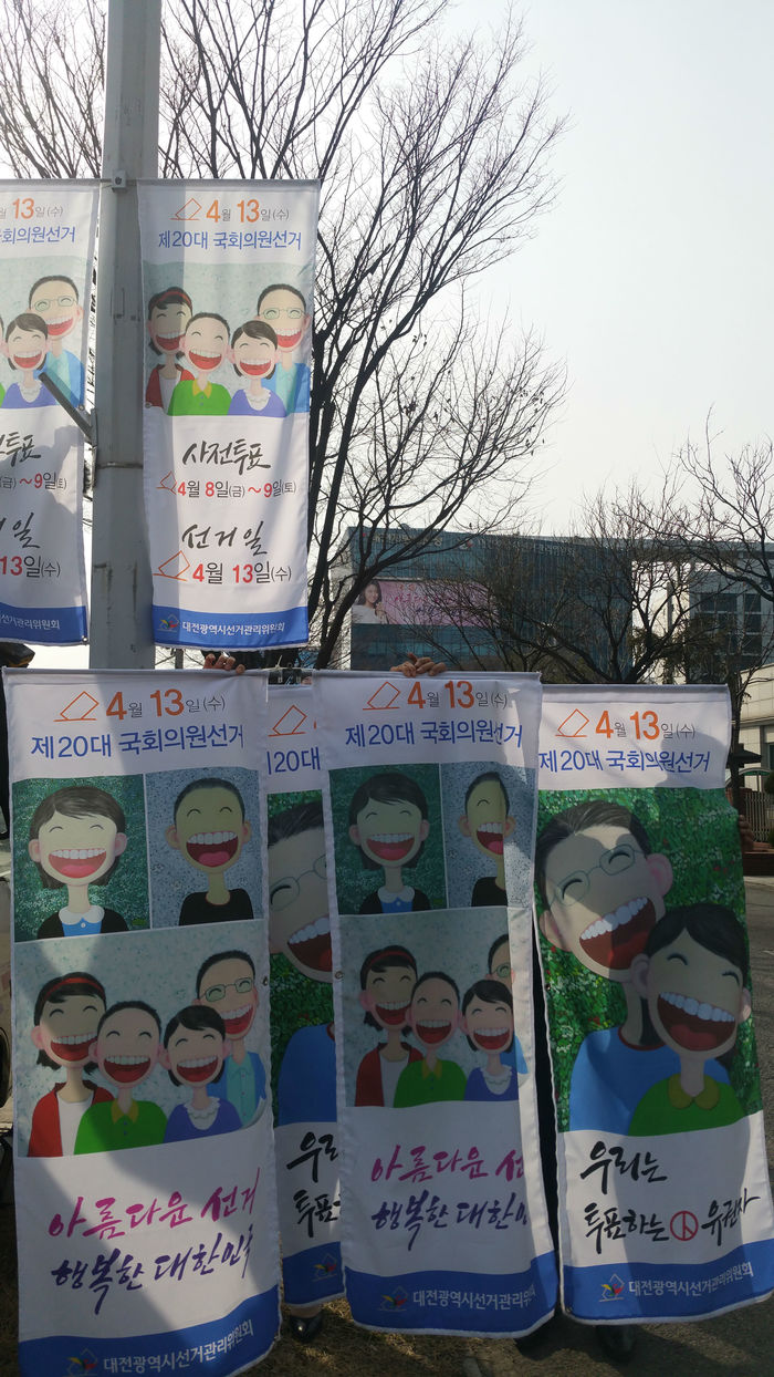 대전광역시선거관리위원회는 오는 4월 13일 실시하는 제20대 국회의원선거를 앞두고 15일 오후 2시에 웃는 얼굴을 작품으로 만든 가로등 현수기를 월평동 정부청사역네거리 일대에 현수기를 게시하였다.