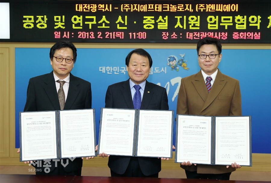 이날 협약식은 염홍철 대전시장을 비롯해 최광현 (주)지에프테크놀로지 대표이사, 조상호 (주)엔씨에이 대표이사 등 관계자 15명이 참석한 가운데 열렸다.