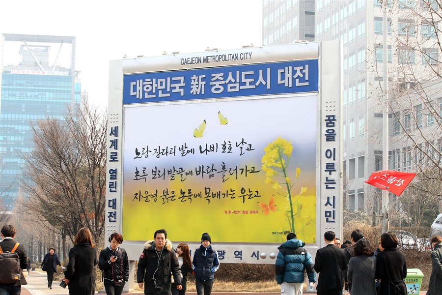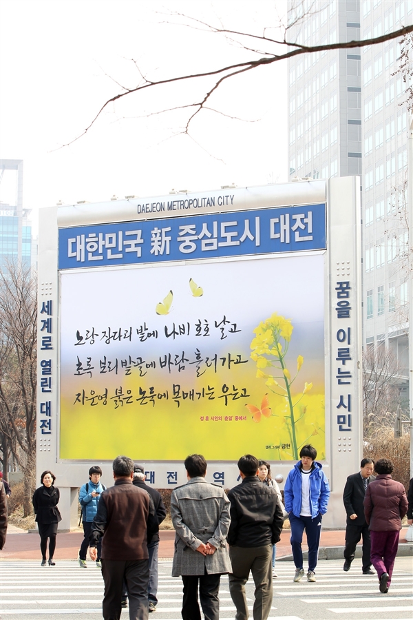 대전시가 시청네거리에 마련한 ‘대전사랑 글 마당’이 봄이 오고 있음을 알려 주는 내용으로 새롭게 바뀌었다. 이 글귀는 대전을 대표하는 작고문인 정 훈 시인의 ‘춘일’중 한 소절이다.