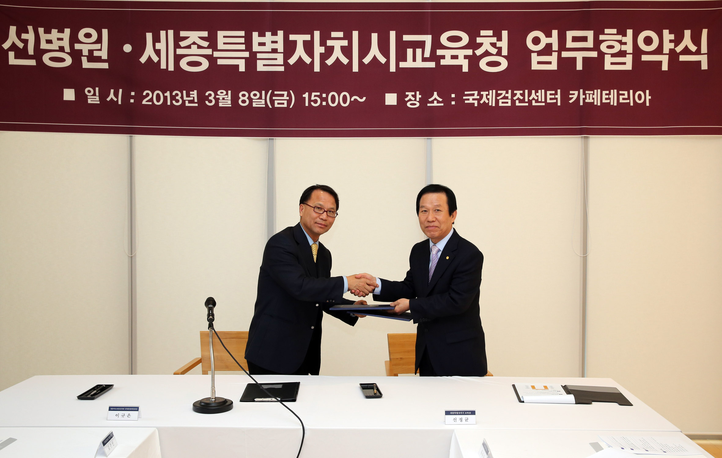 세종시교육청(교육감 신정균. 사진 오른쪽)과 영훈의료재단 선병원(경영총괄행정원장 이규은)은 8일 오후 3시 유성선병원에서 세종시 초.중등 학생들의 진로직업체험지원을 위한 업무협약을 체결했다.
