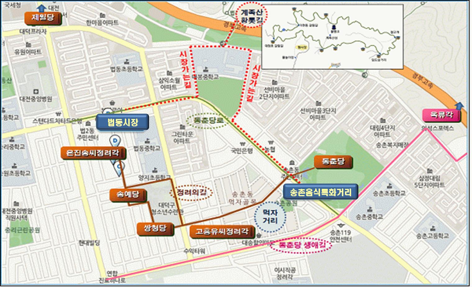 법동 송촌시장 일대인 회덕 송촌은 충신, 효자, 열녀를 많이 배출한 대표적인 선비의 고장으로 동춘당을 비롯해, 고흥류씨 정려각, 충신 이시직공정려각 등 다양한 문화재와 스토리텔링 자원을 보유하고 있다.