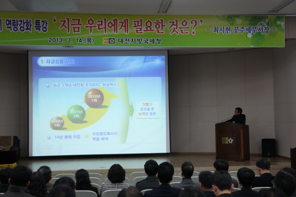 이번 특강은 국세청 인사업무를 담당하고 지난해 말 공주세무서장으로 부임한 최시헌 서장이 2014년 국세청「세종청사」이전 대비 ‘지금 우리에게 필요한 것은’ 이라는 주제로 1시간 반 동안 진행했다.