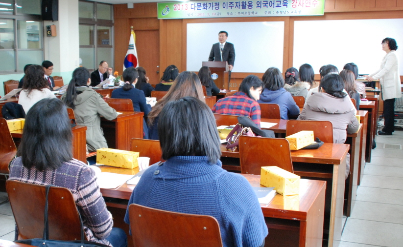 충남교육청은 도내 다문화가정이주자 30명을 대상으로 2013 다문화가정이주자 활용 외국어교육 사업을 추진한다. 효율적인 사업 운영을 위해 도교육청은 15일, 부여초등학교에서 다문화가정이주자활용 외국어 강사를 대상으로 수업전문성 신장과 한국문화 체험을 위한 직무연수를 실시했다. <사진>