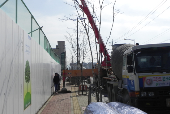 실제 이 현장 인근 도로에는 레미콘 차량들이 2개 차선을 무단으로 점유한 채 공사를 강행하고 있는 모습이 수시로 목격되고 있다.