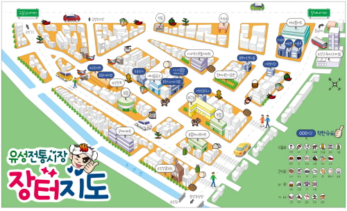 장터지도는 유성구 블로그에 게시되는 웹(web)게시용 지도로 일러스트 방식으로 누구나 편안하게 볼 수 있도록 제작됐다.