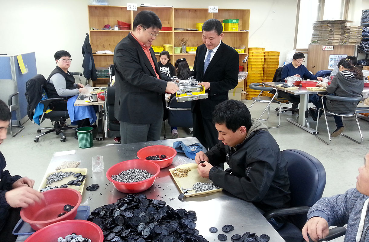 대전시 중구 박용갑 청장이 3일 작업능력이 낮은 중증장애인에게 근로 기회 제공과 직업 적응훈련을 실시하고 있는 안영동 소재 밀알드림센터를 방문 근로자들을 격려하고 현장 체험활동을 했다.