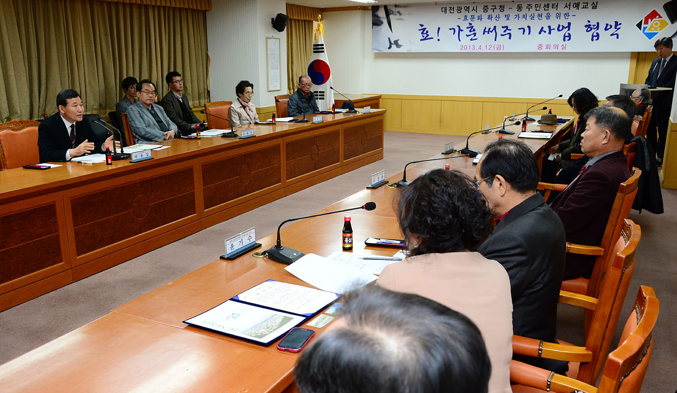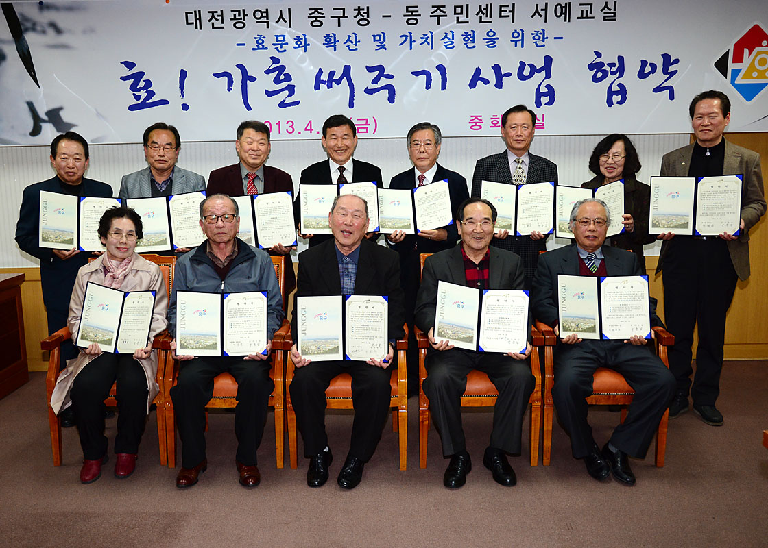 대전시 중구(구청장 박용갑)가 12일 구청 구민사랑방에서 박용갑 중구청장과 동 주민센터에서 운영중인 12개 서예교실 관계자 등이 참석한 가운데 효 문화 확산을 위한 “孝 가훈 써주기 업무협약(MOU)”을 체결했다.