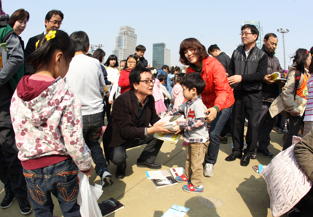 햇살 가득한 한 낮에 샘머리 공원에는 1000여명에 아이와 부모가 함께 모여 각 가정에서 한 번씩 읽고 쌓아 둔 책, 서점에서 팔다 남은 책 등 사장된 책들을 공원에 펼쳐 놓고 재미있는 퍼포먼스 행사와 함께 1인당 5권씩 무료로 나눠 주는 행사를 실시했다.