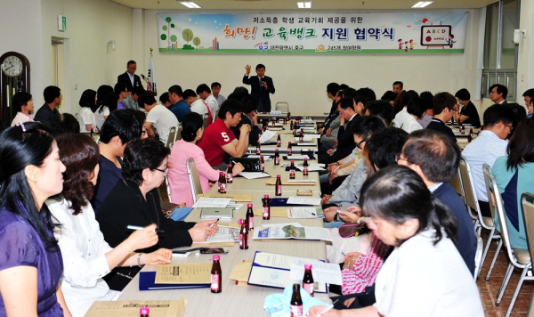 좌로부터 산성동 경희태권도 김범식관장, 박용갑 중구청장, 산성동 광희피아노학원 정광희원장, 대흥동 고구려학원 신용준원장 대전 중구(구청장 박용갑)는 14일, 저소득층 교육비 지원을 위해 관내 245개 학원과『희망! 교육뱅크』지원 협약을 체결했다.