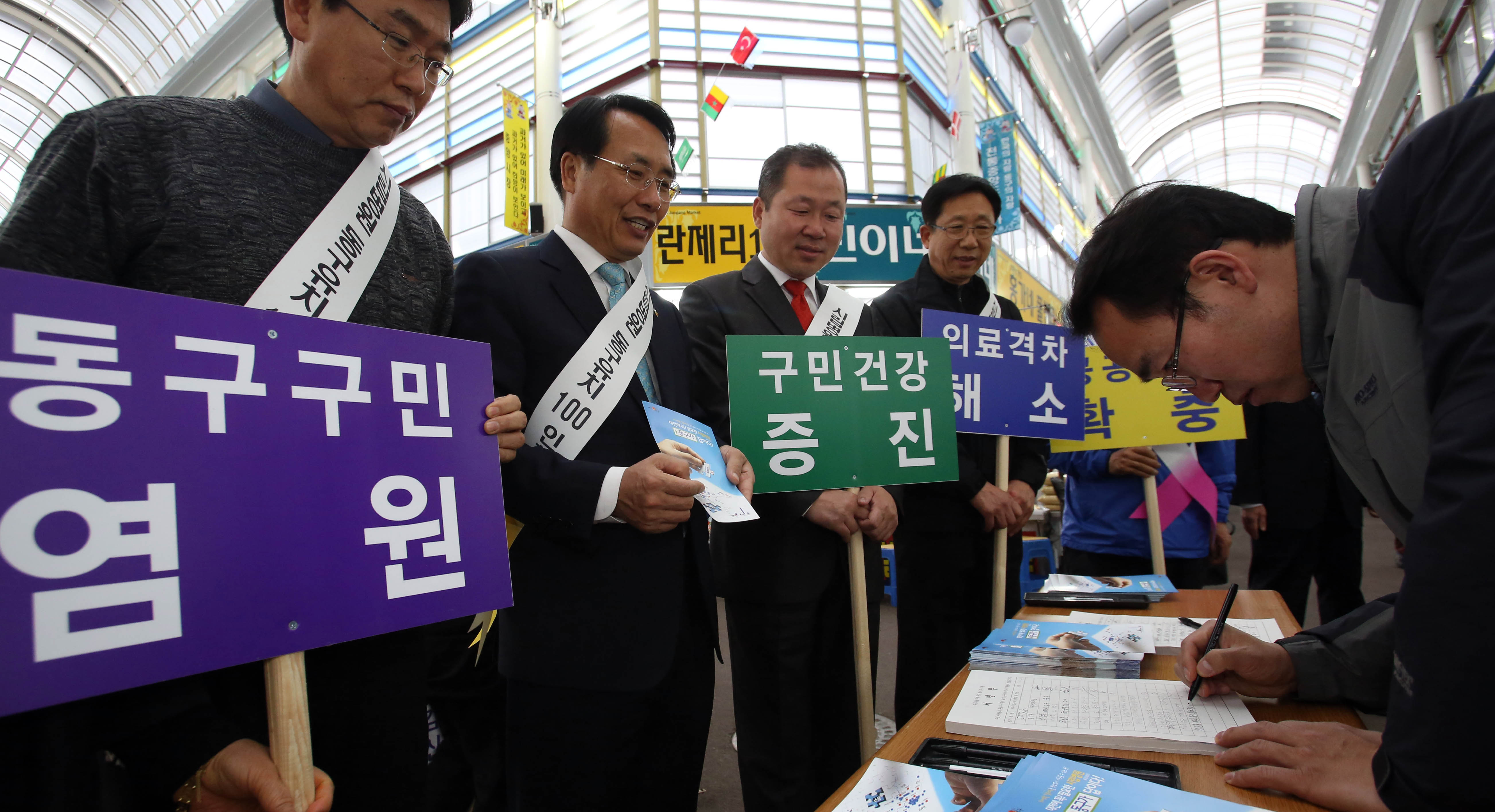 대전 동구(구청장 한현택)는 17일 중앙시장 2길 아케이드 네거리에서 대전시립병원 설립과 동구 유치를 위한 주민홍보 및 범시민 서명운동을 펼쳤다. <사진>