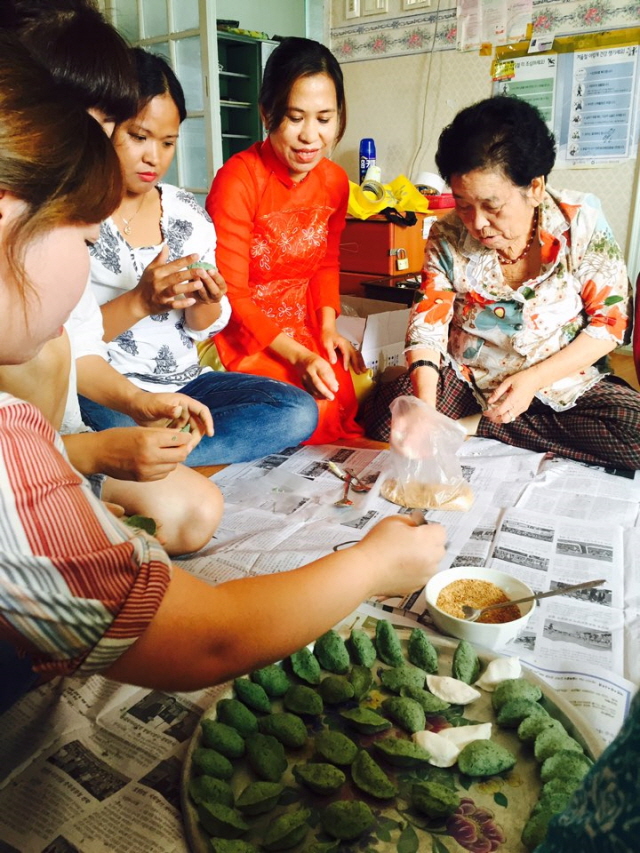 어르신들은 우리 결혼이민여성들에게 쌀가루, 쑥가루, 호박가루 등 반죽을 깨와 콩 등으로 만든 소를 넣어 동그란 모양으로 송편 빚는 방법 등을 가르쳐주며 화답했다.