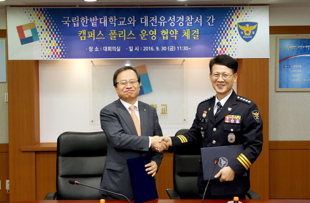한밭대학교(총장 송하영)는 대전유성경찰서(서장 박병규)와 30일(금) 오전 11시 대회의실에서 캠퍼스 폴리스(campus police) 운영을 위한 업무협약을 체결했다.
