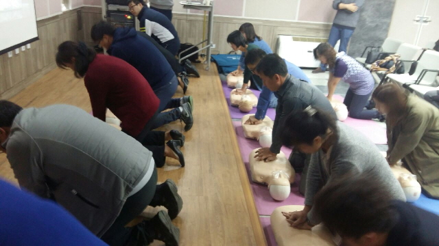 심정지 등 응급상황에 처했을 경우 신속하게 대처할수 있도록 이론과 실습을 병행했으며 마네킹 모형을 활용한 1:1 심폐소생술 실습교육과 자동제세동기 등 응급장비 사용법에 대한 교육이 실습과 함께 실시됐다.