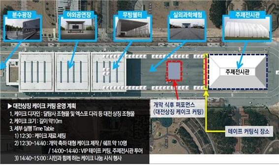 개막식은 엑스포시민광장에서 개최되며, KBS 아나운서인 김재원의 사회로 해군군악대 축하공연, 개막 테이프 커팅, 성심당의 과학케이크 나눔 이벤트 등으로 시민들과 함께 즐기는 장으로 마련된다.