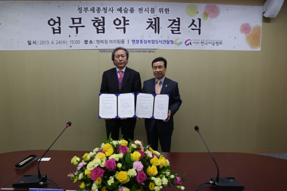 행정중심복합도시건설청(청장 이충재)은 24일 오후 3시 행복청 브리핑룸(304호)에서 한국미술협회(이사장 조강훈)와 정부세종청사 내 예술품 전시를 위한 업무협약(MOU)을 체결했다고 밝혔다.