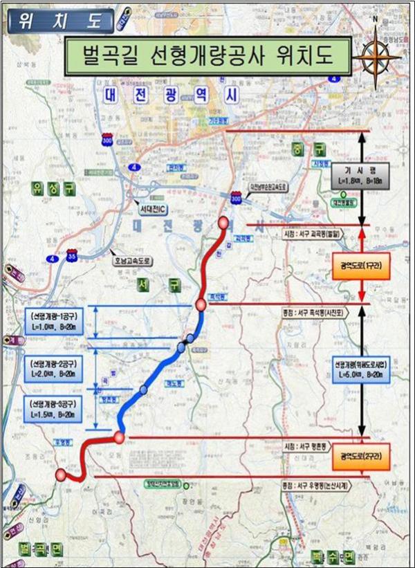 지난 2013년 착공된 이 공사는 서구 기성동 벌곡길 4차로 구간이 끝나는 지점인 왕복2차로 구간에서부터 총연장 1.5㎞를 3년여의 공사기간 동안 총사업비 97억원을 투입해 4차로 확장 및 위험구간을 구조개선 했다.