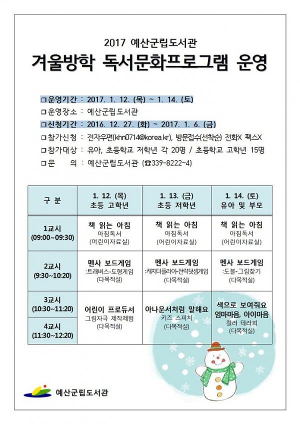 [세종TV-신예지] 예산군립도서관은 겨울방학을 맞아 관내 어린이들이 즐겁게 체험할 수 있는 다양한 독서 문화 프로그램을 다음달 12일부터 14일까지 3일간 운영한다고 밝혔다.