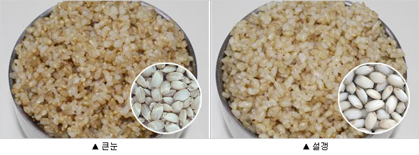 국립식량과학원이 추천한 설갱과 큰눈 현미는 수분 흡수가 빠르기 때문에 밥을 지은 뒤에도 차지고 식감이 부드러워 밥맛이 우수하다.