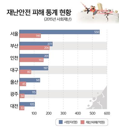 시는 국민안전처의‘2015 재난연감’을 분석한 결과 전국 16개 시도의 도로교통·화재·익사·추락사고 등 사회재난으로 인한 사망자와 재산피해액이 가장 적은 것으로 나타났다.