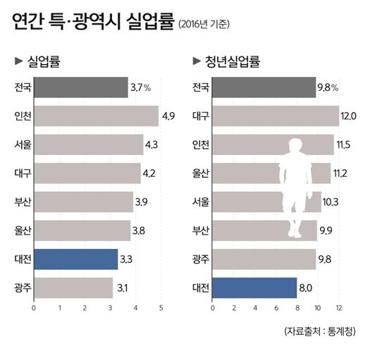 특히 통계청이 발표한 2016년 고용동향에서, 대전의 청년실업률은 8.0%로 특?광역시에서 제일 낮은 실업률을 나타냈다.