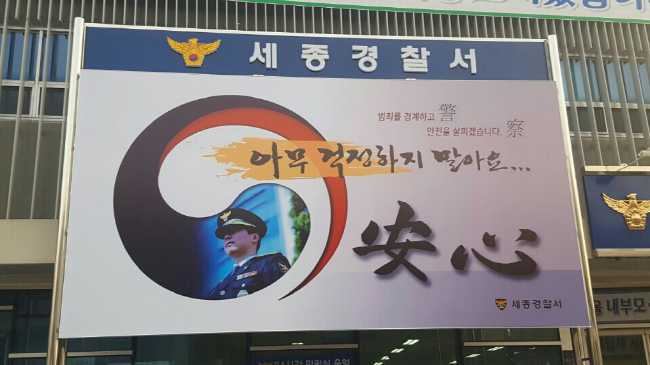 세종경찰서(서장 마경석) 아름파출소는 방문고객만족 및 체감치안 만족을 위해 “범죄를 경계하고 안전을 살피겠습니다. 아무걱정 하지 말아요”라는 문구의 대형 입간판을 파출소 정문 입구에 게시하였다