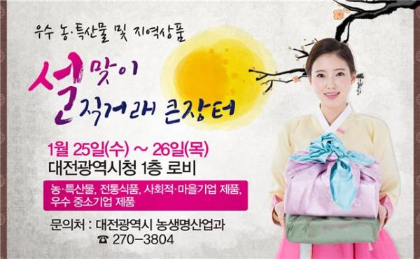 [세종TV-황대혁 기자] 대전광역시는 민족 최대의 명절인 설을 맞이하여 오는 25일부터 26일 양일 간에 걸쳐 시청1층 로비에서‘설맞이 우수 농·특산물 및 우리지역에서 생산하는 지역상품 직거래 큰장터’를 개장한다고 밝혔다.