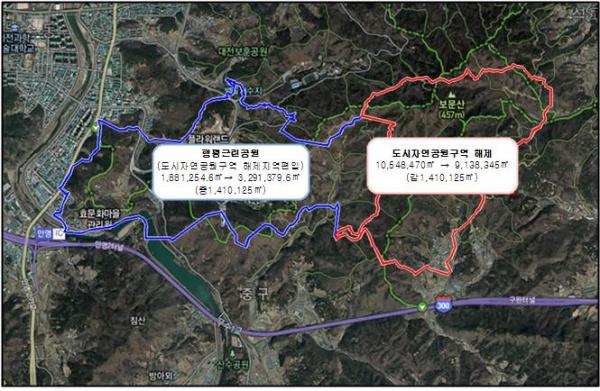 [세종TV-황대혁 기자] 대전광역시는 보문산 도시자연공원구역 중 일부(감1,410,125㎡)를 행평근린공원(증1,410,125㎡)으로 결정(변경)하고자 오는 2월 8일까지 주민의견 청취를 위한 열람 공고를 실시한다고 밝혔다.