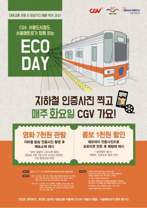 지하철 5~8호선을 운영하는 서울도시철도공사와 1~4호선을 운영하는 서울메트로는 CJ CGV와 함께 지난해 서울시내 CGV 10개 극장에 한정되었던 매주 화요일 지하철 이용 시민 영화할인 혜택인 ‘에코데이(ECO-DAY)’를 수도권 CGV 48개 극장으로 확대한다고 6일 밝혔다. ‘에코데이(ECO-DAY)’는 매주 화요일 지하철을 타고 극장에 가면 7,000원에 영화를 볼 수 있는 이벤트로 오는 7일(화)부터 올해 12월 26일(화)까지 진행된다.