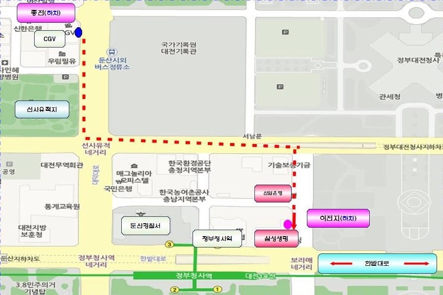 내달 1일부터 대전둔산 시외버스정류소 하차장이 삼성생명 둔산빌딩(한국산업은행 앞)옆으로 이전한다.