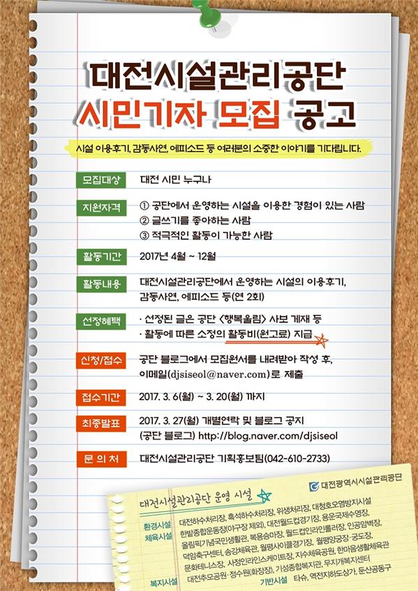 신청은 대전시설관리공단 홈페이지(www.djsiseol.or.kr) 및 블로그(blog.naver.com/djsiseol)에서 지원서를 내려 받아 작성한 후 전자우편(djsiseol@naver.com)을 통해 접수할 수 있으며, 선정결과는 오는 27일 공단 블로그를 통해 발표할 예정이다.