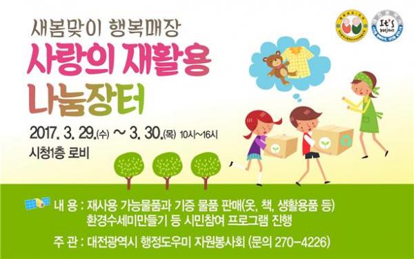 [세종TV-황대혁 기자] 대전시는 대전광역시 행정도우미 자원봉사회 주관으로 오는 29일과 30일 이틀간 오전 10시부터 16시까지 시청 1층 로비에서‘새봄맞이 사랑의 재활용 나눔장터’가 개장한다고 밝혔다.