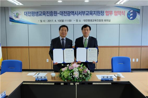 [세종TV-황대혁 기자] 대전평생교육진흥원과 대전광역시서부교육지원청이 지난 10일(월) 오전 11시 진흥원 회의실에서 업무 협약을 체결했다고 밝혔다.