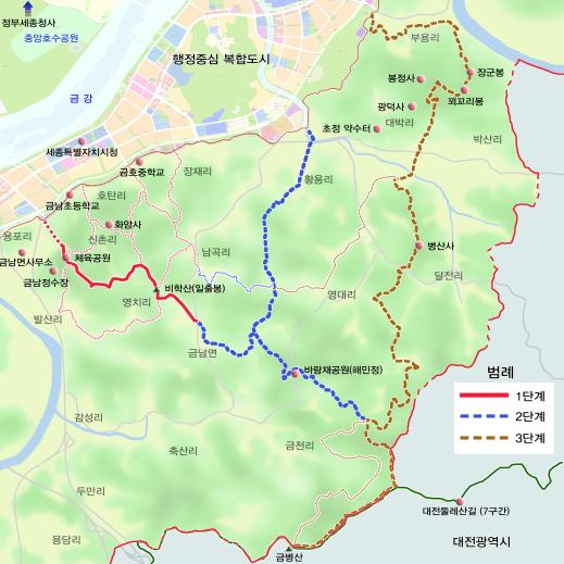 세종시는 개발제한구역 내 행정중심복합도시 건설과 중앙부처 이전에 따라 우수 경관 자원 활용을 위해 지난 1월 ‘개발제한구역 누리길 마스터플랜’을 수립했다.