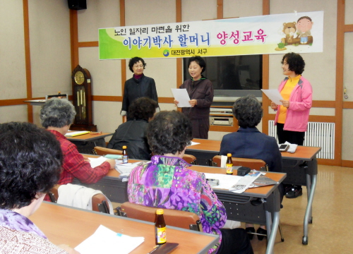대전광역시 서구는 노인들의 소외문제 해결과 일자리 창출의 일환으로 추진한 ‘이야기 박사 할머니 양성교육’ 수료식을 지난 10일 갈마도서관에서 가졌으며, 임묵 부구청장이 참석해 수료자를 격려하고 노인 일자리 마련을 위한 의견 청취 등 소통하는 현장행정을 가졌다.