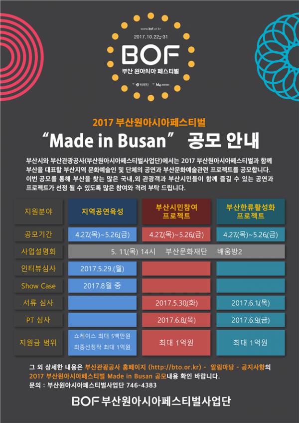 2017. BOF'메이드 인 부산'은 부산원아시아페스티벌이 K-POP에 한정되지 않고 부산의 문화 콘텐츠를 관광자원화 시키고 문화예술인과 단체의 다양한 참여 기회를 제공하고자 부산의 작품을 발굴하는 프로그램이다.