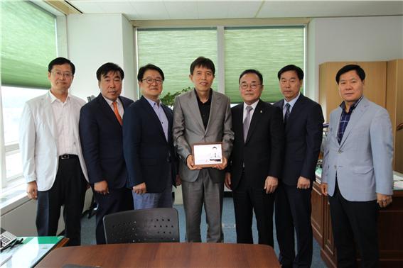 이날 시 건설관리본부를 방문한 정인수 대전시회장은 2015년 7월 부임해 경기침체로 어려움을 겪는 지역건설업체 보호와 육성을 위해 노력해 온 이강혁 본부장에게 고마운 마음을 담아 감사패를 전달했다.
