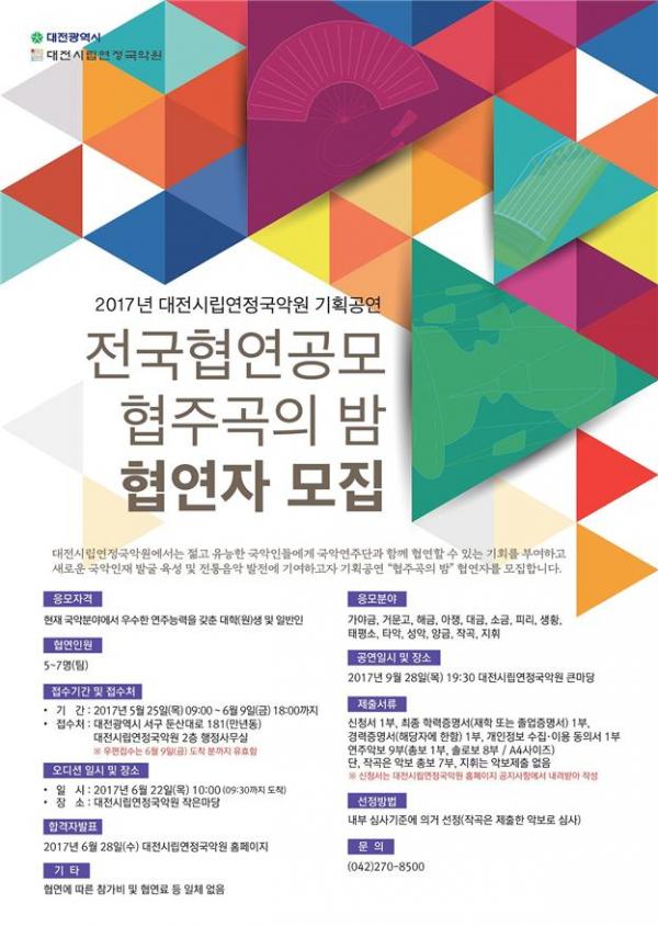 공모 분야는 가야금, 거문고, 해금, 아쟁, 대금, 소금, 피리, 생황, 태평소, 타악, 성악, 양금, 작곡, 지휘이며, 오는 6월 9일까지 접수를 받고, 6월 22일 오디션을 거쳐 협연자를 선정한 후 9월 28일 대전시립연정국악원 큰마당에서 공연을 진행할 예정이다.