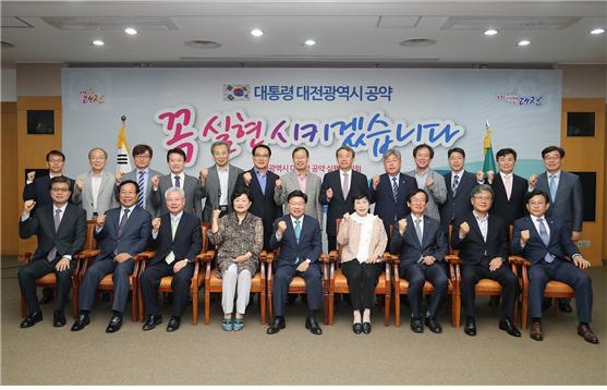 공약으로 반영된 대전광역시 공약과제는 총 9건으로 과학·경제 분야 1건(▲제4차 산업혁명 특별시 육성), 복지·의료 분야 3건(▲대전의료원 설립, ▲국립 어린이재활병원 건립, ▲중부권 원자력의학원 설립), 도시재생·교통 분야 3건(▲ 옛 충남도청 이전부지 조기 활용, ▲대전 외곽순환도로 교통망 구축, ▲도시철도2호선 트램 조기 착공 지원), 지역현안 분야 2건(▲대전교도소 이전, ▲월평동 화상경마장 도시 외곽 이전)이다.