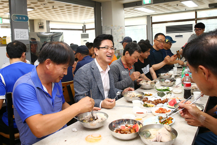 19일 허태정 유성구청장이 유성유스호스텔에서 개최된 환경관리요원 복날행사에 참석해 격려와 함께 오찬을 하고 있다. 저작권자 © SJB세종TV 무단전재 및 재배포 금지 세종TV 다른기사 보기 페이스북 트위터 카카오톡 네이버블로그 구글+ URL복사 기사공유하기