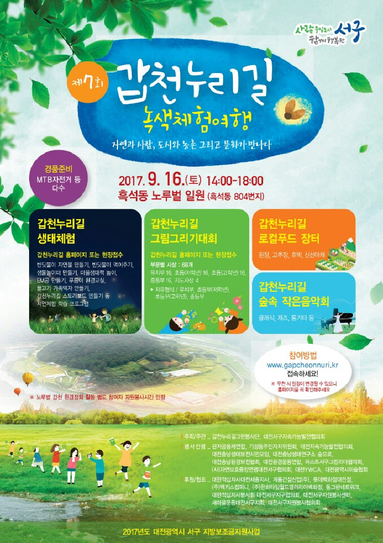 대전 서구는 30일 온 가족이 함께 즐기는 ‘제7회 갑천누리길 녹색체험’ 행사를 개최한다고 밝혔다.