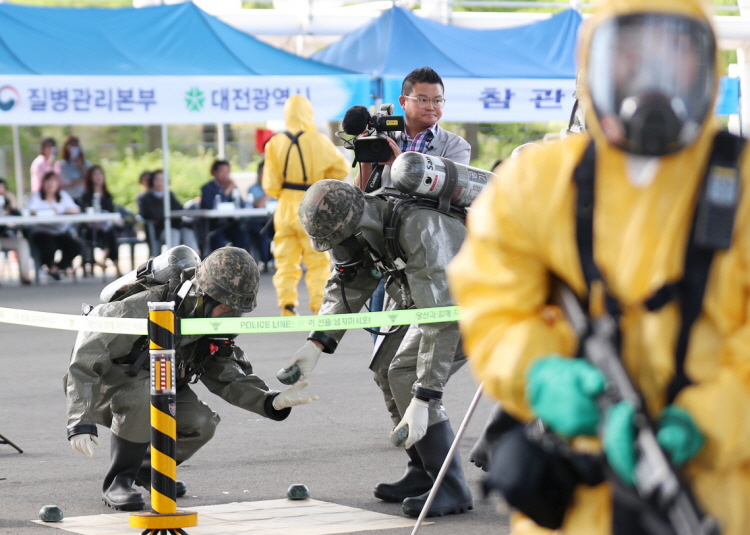 이날 훈련은 훈련은 엑스포시민광장에 탄저균으로 의심되는 백색 가루를 이용한 생물테러 발생을 가정해 ▲신고 접수 ▲상황 전파 ▲현장 출동 ▲현장 통제 ▲생물테러 병원체 탐지키트 검사 ▲환경검체 수거 및 이송 ▲인체 및 지역 제독 순으로 진행됐다.