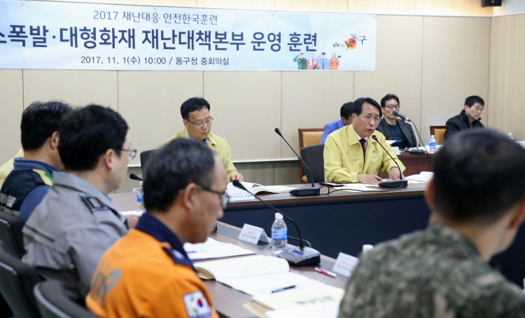 대전 동구가 1일 구청 중회의실에서 2017년 재난대응 안전한국훈련 3일차로 노인요양병원 가스폭발, 대형화재 대응 훈련을 실시했다고 밝혔다