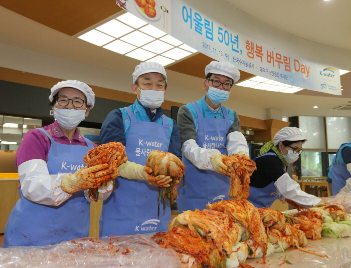 K-water는 창립 50주년을 하루 앞둔 15일, 대전 본사에서 이학수 사장과 이영우 노조위원장을 비롯한 250여 명의 직원들이 참석한 가운데 '어울림 50년 행복 버무림 데이' 사랑의 김장나누기 봉사활동을 펼쳤다.