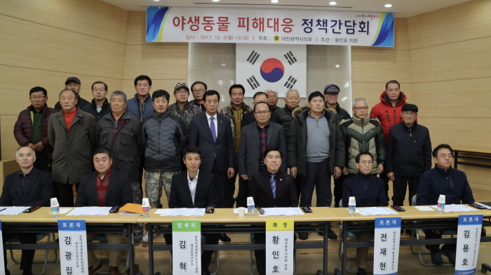 대전시의회 황인호 의원은 4일 산내농협 대강당에서 야생동물로 인한 농작물피해를 예방하기위해서 전재현 대전시 환경정책과장, 김용호 동구 환경보호담당 ,김광집 충청야생생물보호관리협회 대덕구지회 사무장 및 김성규 지역주민 등이 참석한 가운데‘야생동물 피해대응 정책간담회’를 개최했다고 밝혔다.