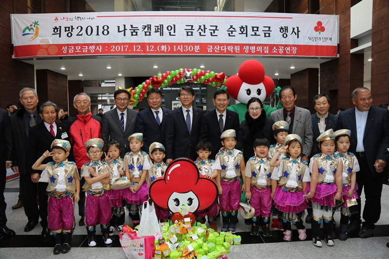 【세종TV-김광무 기자】금산군은 충남사회복지공동모금회와 함께 “나눔으로 행복한 나라”라는 슬로건 아래 희망 2018 나눔캠페인 금산군 순회 모금 행사를 12일 금산다락원 소공연장 및 로비에서 펼쳤다.