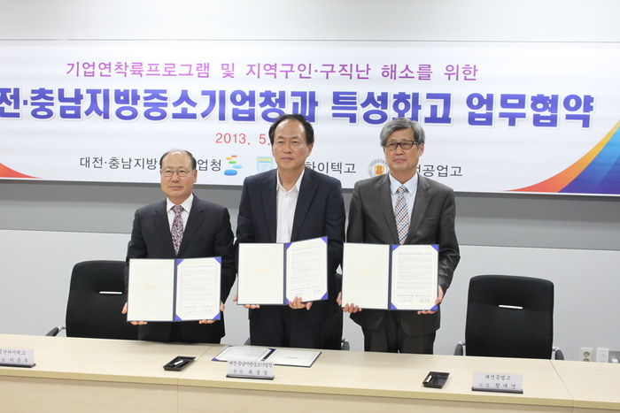 대전공업고(교장 황대연)는 31일 특성화고-대전·충남지방중소기업청-중소기업 간 산학협력을 통한 중소기업의 구인·구직 난 해소를 위해 업무협약을 체결했다.